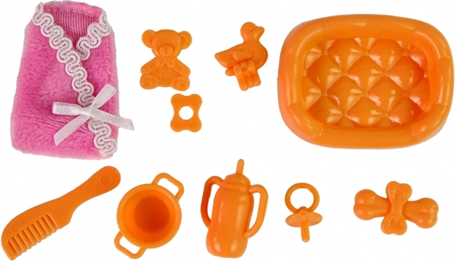 Das Set enthält verschiedene Accessoires wie einen Kamm, eine Badeente und ein Babyfläschchen, die die Spielmöglichkeiten erweitern.