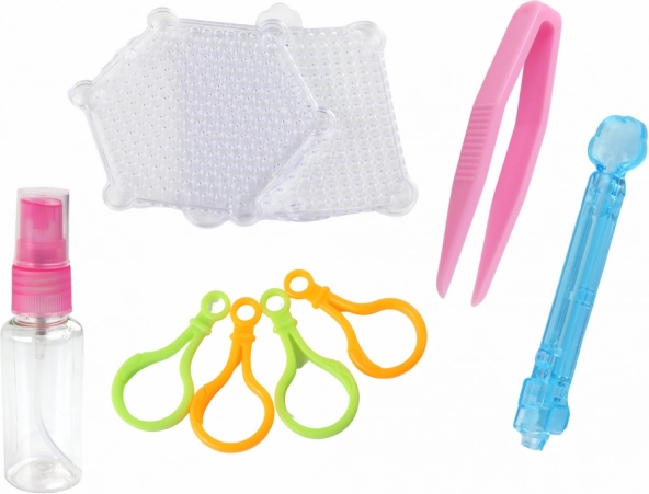 Zwei Steckplatten (Quadrat und Sechseck), Pinzette, Applikator, Sprüher, 4 Anhängerösen und ein Vorlagenheft – alles, was Kinder brauchen.