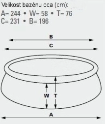 Selbsttragender Pool. Abmessungen 183 cm (oberer Umfang 145 cm) x 51 cm. Wasserstand 41 cm. Kapazität 900 l.
