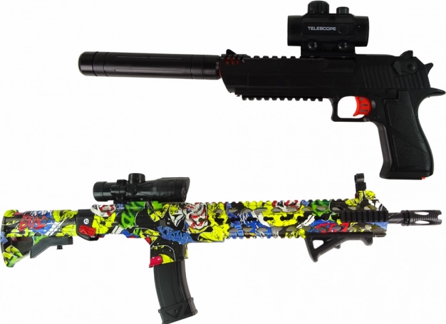 Dieses vielseitige Set aus Wasser-Gelblastern verbindet ein realistisches Aussehen mit sicherem Spielspaß. Der Karabiner im auffälligen, comicbunten Design und die schwarze Pistole mit Schalldämpfer ermöglichen flexibles Spielen – die Pistole kann separat verwendet oder in den Karabiner eingesetzt werden, um die Actionmöglichkeiten zu erweitern. Der wiederaufladbare Akku sorgt für lange Laufzeit und komfortable Nutzung.
