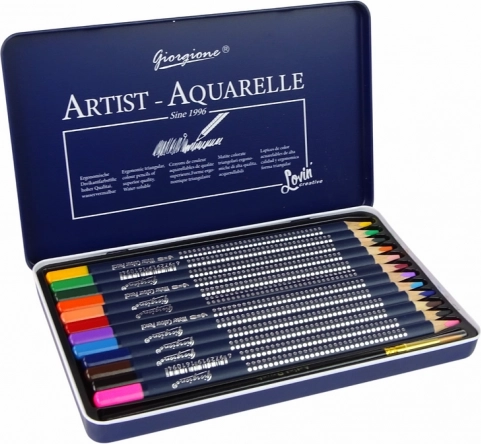 Mit diesem Set von 12 Aquarellstiften und der Metallbox eröffnen sich neue Möglichkeiten für Ihre Kunstwerke. Die Anwendung ist einfach: malen Sie wie mit einem normalen Stift und verwenden Sie anschließend den mitgelieferten Pinsel, den Sie in Wasser eintauchen, um den Aquarelleffekt zu erzeugen. Das stilvolle und kompakte Design dieser Verpackung macht dieses Set zur idealen Lösung für einfaches Tragen und Aufbewahren.