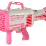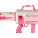 Die Seifenblasenpistole in Weiß und Rosa hat ein auffälliges Design. Sie ist so gestaltet, dass sie einem echten Gewehr ähnelt, erzeugt jedoch statt Kugeln wunderschöne Seifenblasen.