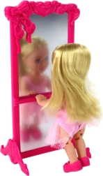 Die elegante Ballett-Mama im rosa Kostüm mit glitzernden Elementen und Tüllröckchen bringt ihrer kleinen Ballerina die ersten Pirouetten bei. Beide Puppen tragen rosa Ballettschuhe und haben lange blonde Haare, die für die Tanzstunde frisiert sind. Der große rosa Spiegel mit Verzierungen schafft eine magische Bühne für das tägliche Training und große Auftritte.