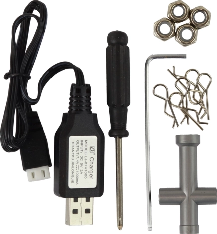 Dank LED-Scheinwerfern macht das Modell auch bei Abendfahrten Eindruck. Der 1400-mAh-Akku bietet 12–16 Minuten Fahrzeit pro Ladung und lässt sich mit dem beiliegenden USB-Ladegerät einfach aufladen. Die Fernsteuerung mit einer Reichweite von bis zu 60 Metern verwendet gängige AA-Batterien.