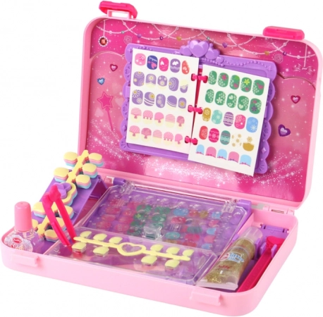 Dieser niedliche rosa Koffer mit violetter Glitzerschleife ist mehr als nur ein Spielzeug – er ist ein kleines Kreativstudio für angehende Stylistinnen. Beim Öffnen entdecken Kinder eine bunte Auswahl an Accessoires, mit denen sie nach eigener Fantasie eine originelle und schöne Maniküre zaubern.