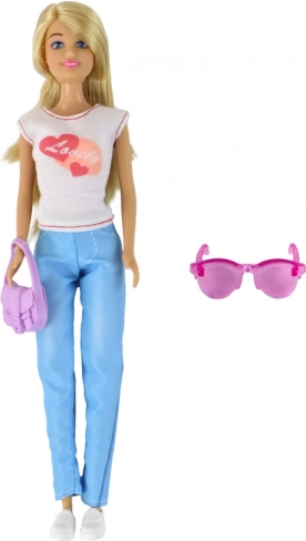 Die Puppe trägt ein weißes T‑Shirt mit Herz/Lippen-Motiv, blaue Hosen und weiße Sneakers. Die violette Handtasche und die rosa Sonnenbrille ermöglichen vielfältige stylische Kombinationen für jeden Anlass.