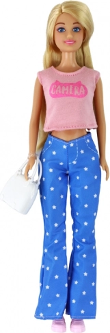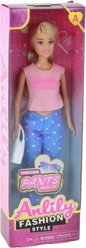Entdecken Sie die Puppe Anlily, die zu stundenlanger Kreativität und Modespielen inspiriert. Dank ihrer langen blonden Haare und blauen Augen können Kinder kämmen, schmücken und unzählige Frisuren kreieren. Das stylische Outfit mit rosa Bluse und Hosen mit Sternen verleiht der Puppe einen modernen Look.