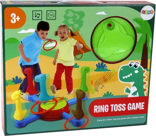 Ein lustiges und geschicklichkeitsförderndes Spiel für Kinder mit Dinosauriermotiven, die Freude daran haben, Ringe auf bunt gefärbte Tiere zu werfen.