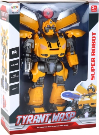 Der Roboter verfügt über gelenkige Gliedmaßen, ein detailreiches „gepanzertes“ Erscheinungsbild und ein gelb-schwarzes Farbschema, das sofort ins Auge fällt.