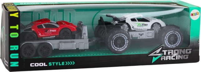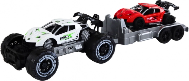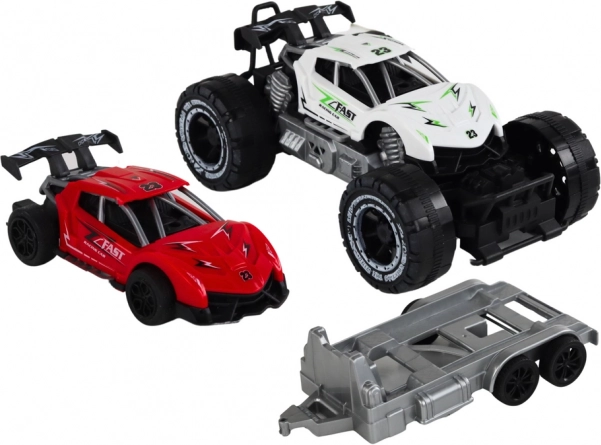 Dieses Spielzeugset enthält einen weißen Offroad-Wagen und einen roten Sportwagen auf einem Anhänger, der die Kreativität und Vorstellungskraft beim Spielen fördert. Kinder können ihre eigenen Geschichten voller Rennen und Abenteuer im wilden Gelände erfinden. Der Anhänger lässt sich einfach abnehmen, was neue Kombinations- und Spielmöglichkeiten eröffnet.