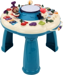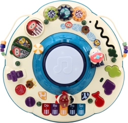 Die Hängetafel mit vier Figuren in vier verschiedenen Farben entwickelt die manuellen und logischen Fähigkeiten des Kindes, stimuliert Kreativität und Konzentration. In der oberen Ecke des Tisches befindet sich eine Trommel, um die sich die Tierchen drehen – das sorgt für Bewegung und zusätzliche Attraktivität.