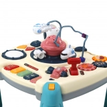 Der Tisch ist mit einem Karussell und Getrieben ausgestattet, die Kinder zur Bewegung und Erkundung motivieren.