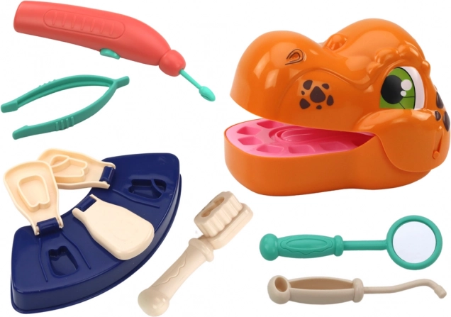 Dinosaurierkopf, 7× dentale Werkzeuge, 10× Knetefarbe, Formen für Zähne und Zahnspangen
