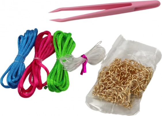 Dank der verschiedenfarbigen Schnüre (Rosa, Grün, Blau), der Angelschnur und des Zubehörs können Kinder Schmuck für unterschiedliche Anlässe entwerfen. Enthalten sind auch niedliche Haargummis und Haarspangen sowie Clip-Ohrringe – geeignet auch für Kinder ohne Ohrlöcher.
