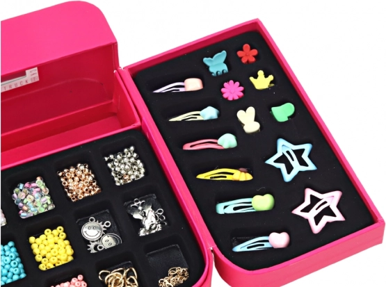 Dieses umfangreich ausgestattete Set fördert Kreativität, Feinmotorik und Sinn für Ästhetik. Im Inneren finden Sie eine bunte Mischung aus Perlen, Anhängern und Komponenten zur Herstellung einzigartiger Armbänder und Accessoires. Das Schmuckkästchen mit integriertem Spiegel und Fächern hält alles übersichtlich geordnet.