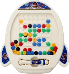 Diese einzigartige magnetische Tafel bietet unbegrenzte Möglichkeiten für kleine Künstler. Das Set enthält bunte Perlen in den Farbtönen Rot, Gelb, Grün, Blau und Schwarz, die zur Gestaltung fantastischer Bilder und Muster einladen. Ein spezieller magnetischer Stift ermöglicht es den Kindern, die Perlen frei zu manipulieren, was die Präzision der Bewegungen und die manuelle Geschicklichkeit fördert.