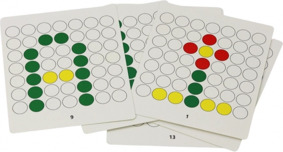 Das Set umfasst auch 7 Karten mit verschiedenen Mustern, die ideal zum Nachmachen und Üben der Feinmotorik sind. Unsere Tafel ermutigt jedoch zu kreativem Denken und Experimentieren, was es den Kindern ermöglicht, eigene, einzigartige Kompositionen zu schaffen und ihre künstlerischen Talente zu entdecken.