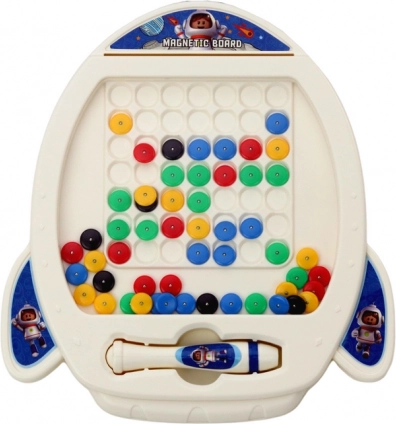 Diese Tafel in Form einer Rakete fördert die Entwicklung der Kreativität und Feinmotorik beim Spielen mit Perlen.