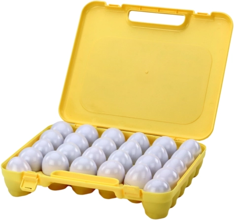 Die gelbe Koffer-Tasche ermöglicht einen einfachen Transport der Eier und schützt sie vor Beschädigungen. Diese Eigenschaft macht das Spielzeug ideal für Reisen.