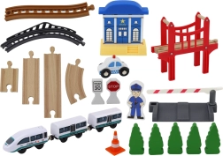 Diese hochwertige Holzeisenbahn eröffnet Kindern die Welt der Eisenbahnabenteuer. Dank der umfangreichen Ausstattung – einschließlich Brücke, Polizeistation, Schranke, STOP-Schild und Polizistenfigur – können sie eigene Geschichten erfinden und ihre Kreativität entfalten. Stabile Holzschienen ermöglichen das Bauen verschiedener Rundkurse mit einer Gesamtlänge von bis zu 3,2 m.