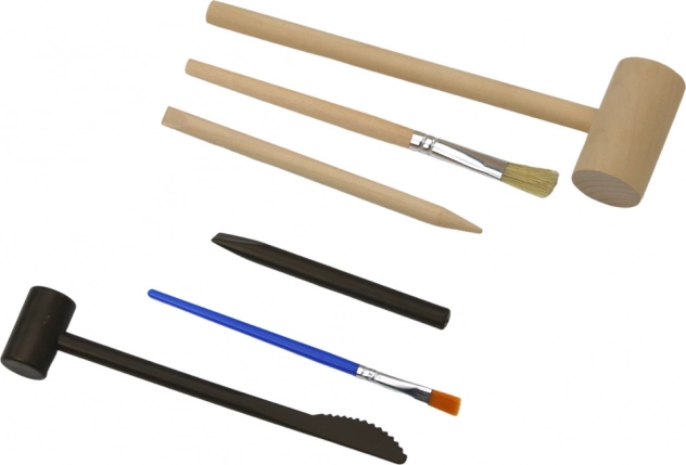 Beinhaltet einen Holzhammer, Pinsel und Meißel - alles Notwendige für den Start einer spannenden archäologischen Expedition.