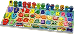 Das Brett enthält verschiedene Sortierer, die Kindern helfen, logisches Denken und motorische Koordination zu entwickeln. Der Sortierer umfasst Elemente wie Verkehrsmittel, Tiere, Obst, Zahlen und Familienmitglieder auf Englisch. Dank der Vielfalt der Elemente lernt das Kind, Gegenstände zu erkennen und zu benennen und sich einen grundlegenden englischen Wortschatz anzueignen.