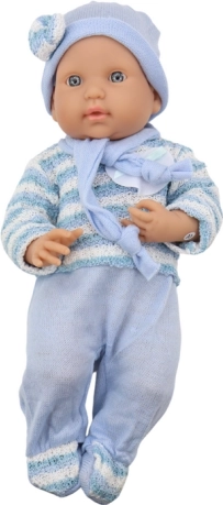 Das gestrickte Jäckchen in blau-weißen Streifen, das passende Mützchen und der Schal sind angenehm zu berühren und laden zum Kuscheln ein. Das Spielzeug besteht aus Materialien, die die Normen CE und EN 71 erfüllen, sodass Sie sich bei täglichem Spiel auf die Sicherheit verlassen können.