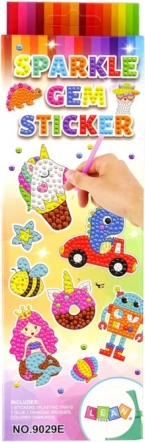 Entdecken Sie unterhaltsame und kreative Sticker für Kinder mit der Technik des Diamond Paintings. Das Set fördert Feinmotorik, Geduld und Konzentration. Enthält 6 Vorlagen, bis zu 16 Farben von Steinchen und praktisches Zubehör für müheloses Basteln. Zertifiziert nach CE und konform mit EN71 – sicher ab 5 Jahren.
