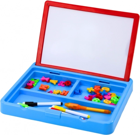 Unter der Tafel befindet sich ein praktischer Stauraum mit 3 Fächern für sämtliches Zubehör – Marker, magnetische Buchstaben und Ziffern sind im Lieferumfang enthalten. Die zweiseitige Ausführung ermöglicht verschiedene Arten des Gestaltens und Lernens, und dank des einfachen Abwischens können Kinder immer wieder neu kreativ werden.