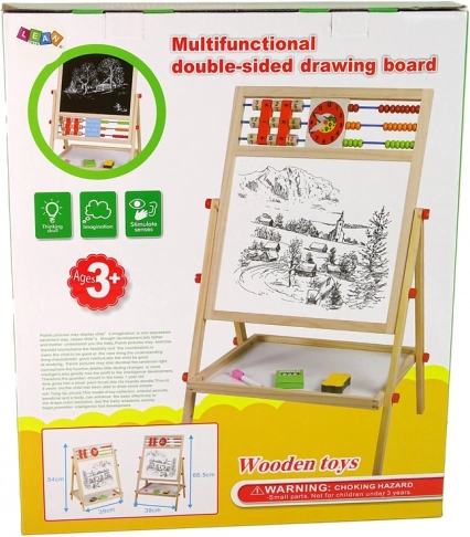 Die zweiseitige, pädagogische Zeichentafel mit Abakus, Uhr und Alphabet ist ein hervorragendes Lernspielzeug für die Kleinsten. Sie besteht aus massivem Holz und sorgt für Langlebigkeit und Sicherheit beim Spielen. Die drehbare Konstruktion ermöglicht die Nutzung von zwei unterschiedlichen Oberflächen: eine Seite mit schwarzer Beschichtung, ideal zum Malen mit Kreide, und die andere, weiße Seite, ideal zum Zeichnen mit Filzstiften.