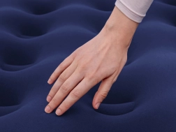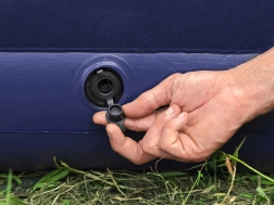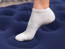 Die Matratze lässt sich ohne Strom ganz einfach aufpumpen – ein paar Fußtritte genügen. Ideal zum Camping und für Notübernachtungen.
