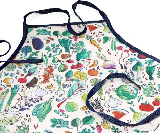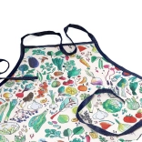 Die bunten Muster auf Schürze und Handschuhen machen Gartenarbeit zu einer freudigen Aktivität.