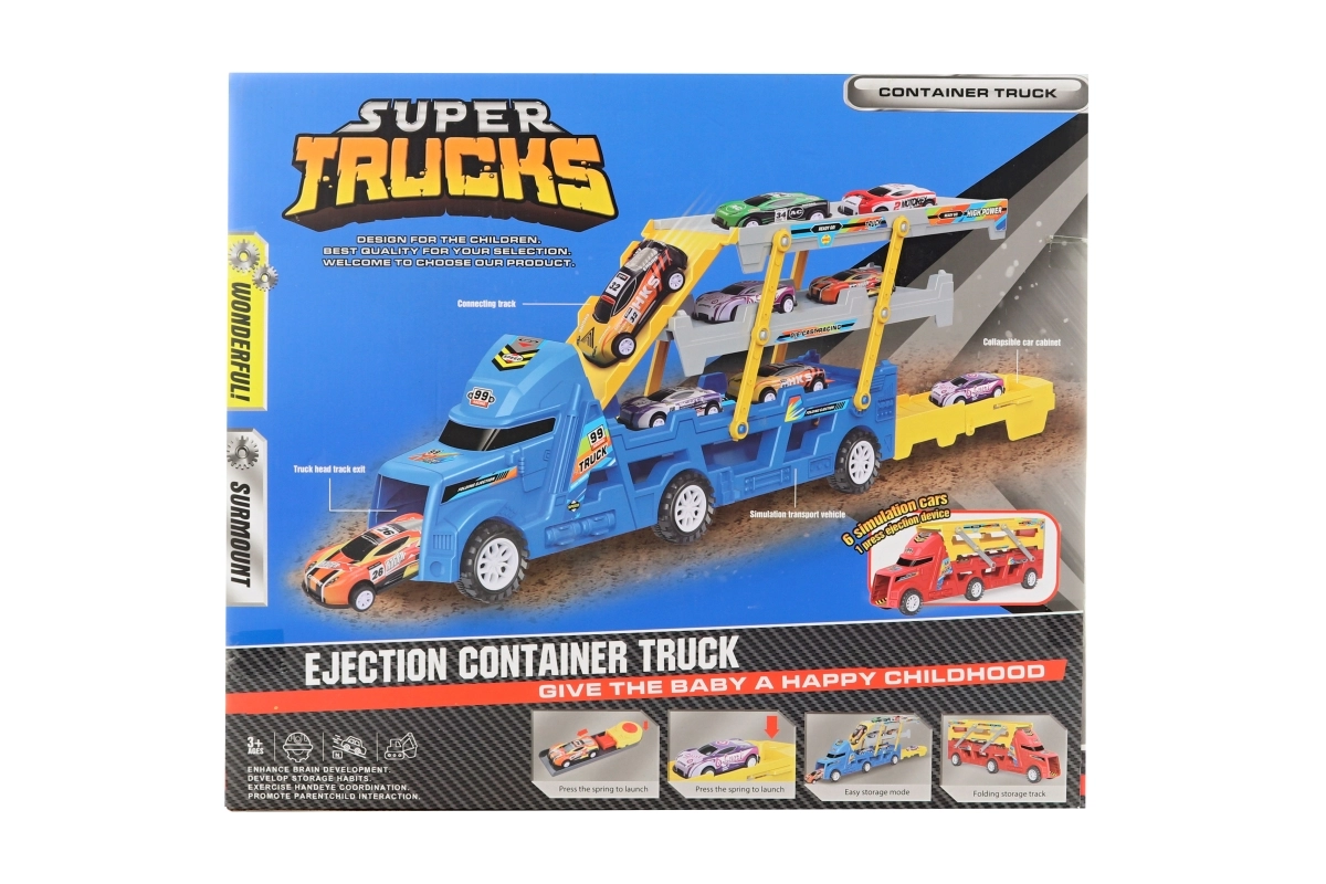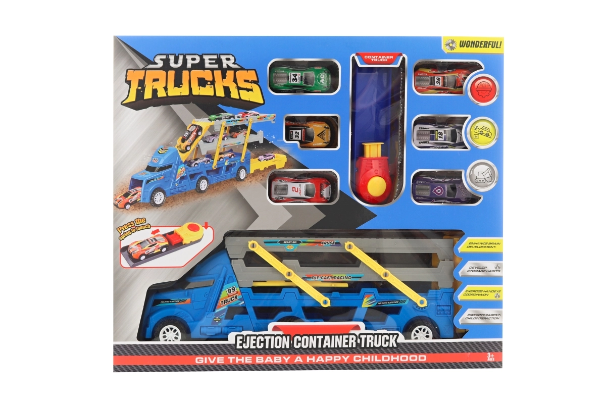 Ein spaßiges Set für kleine Fahrer bringt actionreiche Fahrten: ein großer Lkw, 6 Rennflitzer und eine ansteckbare Abschussrampe. Mit einem Knopfdruck wird das Auto blitzschnell abgeschossen durch den unteren Teil des Lkws. Ideal für dynamisches Spiel und zur Förderung von Motorik und Vorstellungskraft bei Kindern ab 3 Jahren.