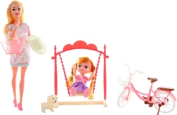 Entdecken Sie ein großes Puppenset mit Zubehör, das stundenlange kreative Unterhaltung bietet. Enthalten sind eine bewegliche Puppe 30 cm, eine kleinere Puppe 16 cm, ein rosafarbenes Auto 33 cm, ein Roller 30 cm, ein Fahrrad 17 cm, eine Schaukel, ein Hündchen sowie stylische Accessoires wie Hut, Helm und Tasche. Hochwertige Ausführung aus Kunststoff, verpackt in einer Geschenkbox. Alter 3+.