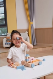 Die Bausteine bestehen aus Buchenholz, sind in harmonischen Farben gestrichen und für Kinder sicher. Nach dem Spielen können die Bausteine zurück in den Wagen gelegt werden, was eine einfache Ordnung ermöglicht. Dank der Schnur kann das Kind den Wagen mit den Bausteinen über den Boden ziehen, was nicht nur Spaß macht, sondern auch praktisch ist.