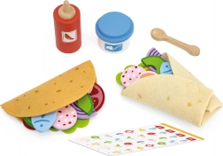 Wraps, Soße, „Joghurt“ und mehr als zwanzig bunte Holz-Zutaten (z. B. Avocado, Zwiebel, Käse oder Fisch) ermöglichen Kindern, jedes Mal neue Tacos und Burritos zu kreieren.