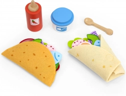 Filz-Wrap, festere Taco-Schale, Flasche scharfer Soße, „Joghurt“-Becher, Holzlöffel, ca. 20 Holzzutaten (z. B. Avocado, Zwiebel, Käse, Fisch u. a.), bunte Menükarte