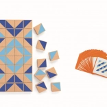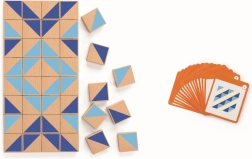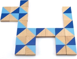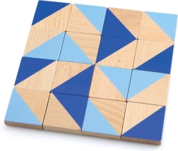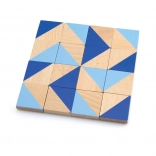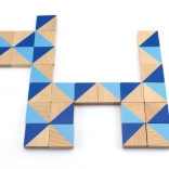 Vielseitige geometrische Teile in Blautönen und naturbelassenem Holz ermöglichen unendlich viele Figuren und Muster.