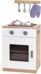 Stilvoller Holzherd mit Backofen und umfangreichem Zubehör für kreatives Spielen. Kinder genießen realistisches Kochen dank drehbarer Knöpfe, Hängeschiene und durchsichtiger Ofentür. Enthalten sind Topf, Pfanne, Topfhandschuh und weiteres Zubehör. Ideal zur Förderung von Fantasie, Feinmotorik und sozialen Kompetenzen. Sicheres Holz, realistische Details, kompakte Abmessungen und Spielspaß für Kinder ab 3 Jahren.