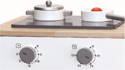 Zwei Kochplatten, drehbare Knöpfe und ein Backofen mit transparenter Tür motivieren Kinder zum kreativen Spiel und fördern ihre Fantasie.