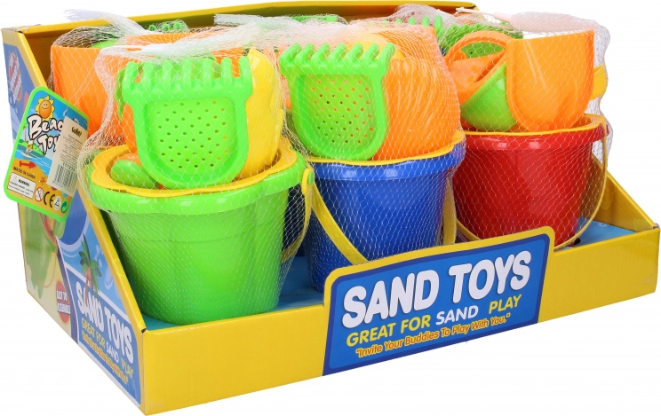 Burg bauen oder Bäbchen machen geht mit diesem bunten Plastikset ruckzuck! Das Set ist geeignet für den Sandkasten, am Wasser und im Garten.
