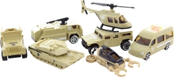 Militärset mit großem Panzer, 6 kleinen Autos und 1 Hubschrauber. Material: Kunststoff. Verpackt im Karton. Verpackungsmaße ca. 46 × 23,5 × 11 cm. Alter 3+