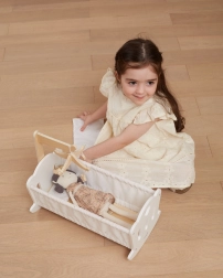 Dank der stabilen Holzteile und dem beigefügten Kissen mit Decke entsteht für die Puppe ein gemütlicher Ruheplatz. Die Wiege passt perfekt ins Kinderzimmer und unterstützt soziale Fähigkeiten, Vorstellungskraft sowie fein- und grobmotorische Entwicklung.