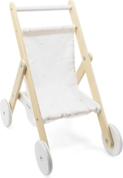 Der Textilsitz mit Nachthimmelmotiv fühlt sich angenehm an und ist pflegeleicht. Der praktische Unterkorb fasst kleine Accessoires, Fläschchen oder Lieblingsspielzeug. Der Wagen ist ideal für Puppen und Kuscheltiere bis zu einer Größe von etwa 38 cm.