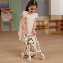 Schenken Sie Kindern ein realistisches Eltern-Rollenspiel mit einem eleganten Holzpuppenwagen. Zeitloses Design, hochwertige Materialien und eine sichere Verarbeitung sorgen dafür, dass jeder „Ausflug“ mit der Puppe bequem und leise ist. Gummilaufflächen an den Rädern reduzieren Bodengeräusche und erhöhen die Stabilität bei den ersten Schritten.