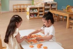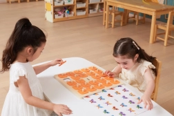 Die massive Holztafel mit 25 quadratischen Feldern und orangefarbenen Abdeckplättchen mit Griffen ist robust und angenehm für kleine Kinderhände.
