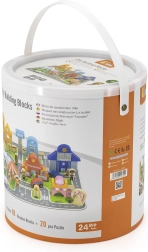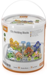Dieses hochwertige Holz-Bauset bringt Kindern eine komplette Stadt auf eine Spielunterlage. Mit den 20 Puzzleteilen werden zuerst Straßen und Flächen gelegt, anschließend entstehen aus 60 farbigen Bausteinen die Gebäude. Fahrzeuge, Figuren verschiedener Berufe sowie Zubehör wie Bäume und Verkehrsschilder sorgen für ein noch realistischeres Spiel.
