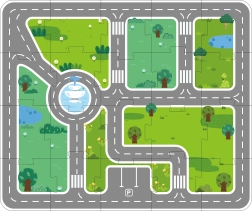 Die 20-teilige Unterlage mit Straßen und Parkplätzen schafft eine übersichtliche Umgebung für alle Bauten und Fahrzeuge. Kinder üben räumliche Orientierung und Verkehrsregeln.