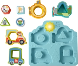 Über die freundliche Sonnen‑Taste werden zusätzliche Soundeffekte aktiviert, die zu weiteren Versuchen motivieren und die Sinneswahrnehmung stärken. Die Formen können sowohl auf der Basis als auch direkt auf den passenden Fahrzeugteilen sortiert werden – das fördert ganz natürlich Logik und räumliches Denken.