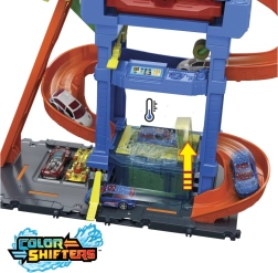 Die Hot Wheels City Color Shifters Autowaschanlage mit drehbarem Tunnel bringt actionreiche Farbwechsel und interaktive Elemente ins Spiel. Kinder können ihr Auto mit dem manuell bedienbaren Aufzug ins Obergeschoss befördern und beobachten, wie sich sein Look im warmen Wasser sofort verändert. Anschließend geht es über die Rampe durch die Schaumbürste, und im „Detailing“ wird alles bis zum letzten spaßigen Schritt perfektioniert.